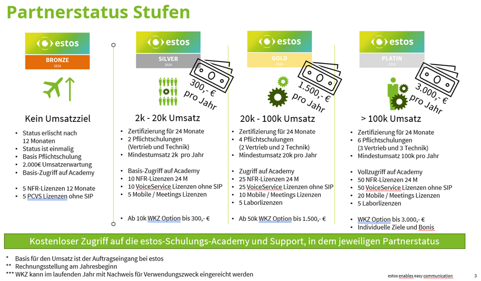 - Die einzelnen Partnerstatis beinhalten eine Jahresgebühr, im Gegenzug stellt estos dafür gratis-Schulungen, Support und Kickback für WKZ